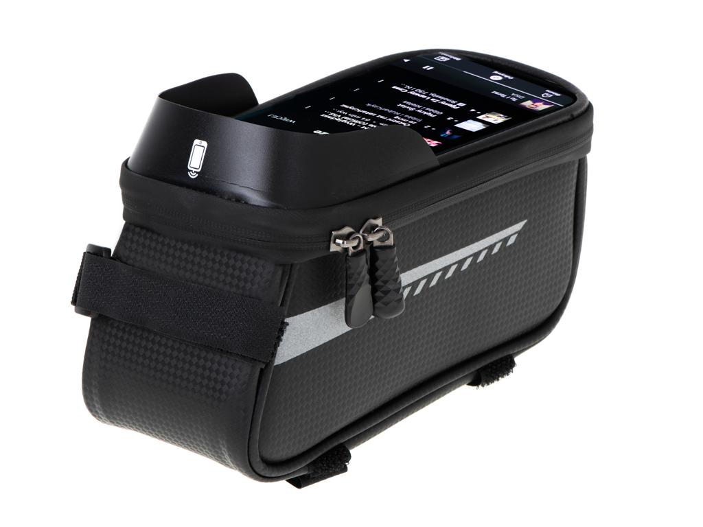 Practical black bicycle bag made of waterproof material. Ideal for long rides serving as a storage compartment for gadgets. Special place for your phone allowing you to use your smartphone while riding. Material: polyester. Dimensions: 21x10x13cm.BIKE BAG